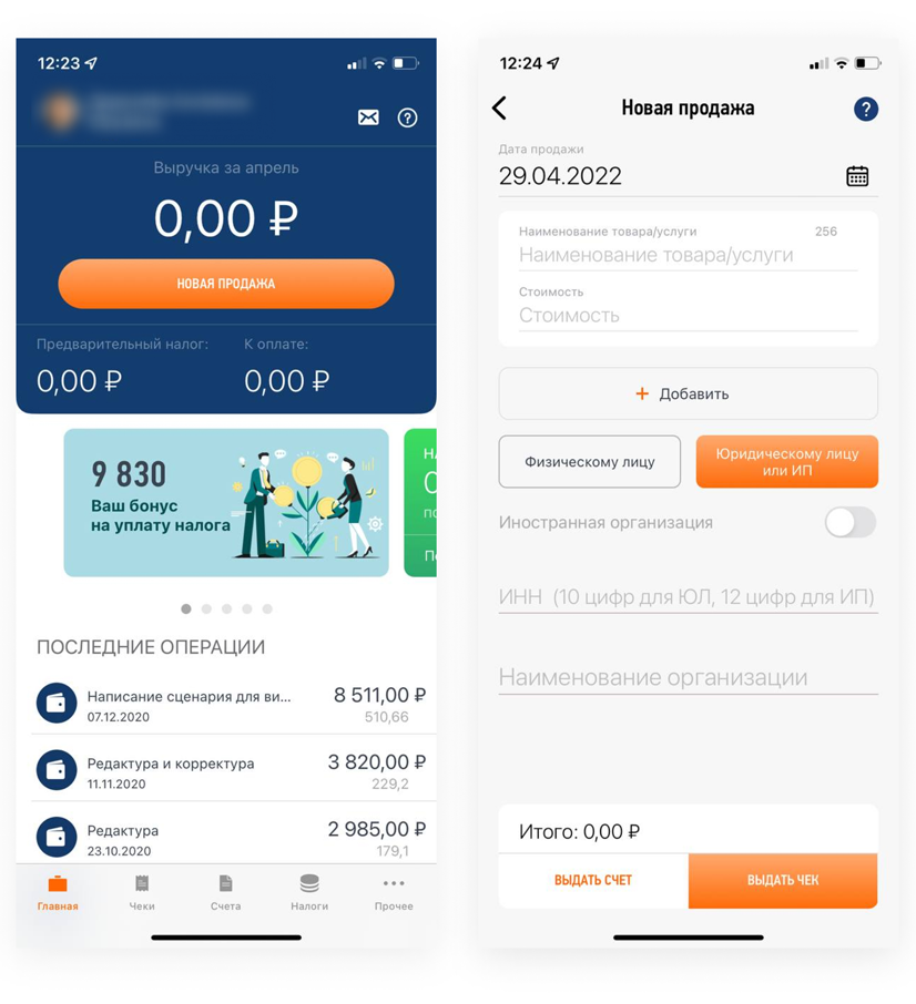 Для этого нажмите кнопку «Новая продажа» на главной странице приложения. Далее выберите дату получения оплаты, название услуги и её стоимость, введите ИНН организации — её наименование добавится автоматически. Затем нажмите «Выдать чек».